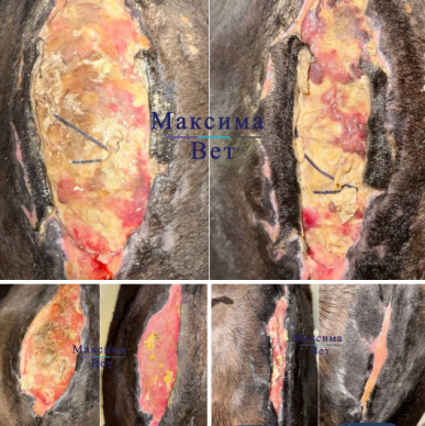 Жеребенок, которого мы успешно избавили от колик, на этапе выздоровления проявлял повышенную активность. В результате, его резвость привела к тому, что послеоперационный шов разошелся, а рана – инфицировалась.